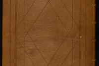 The brown calf covers are tooled in blind with three lines, running close to the edges of the boards; a roll showing heads in medallions (Oldham HMa(9)7781) with lines at both sides forms the borders of a large centre panel. At the outer corners of the panel are large composite fleurons tooled in gold, while in the centre gouges (curved lines) and branch tools form a cartouche, with a triangular tool at the top and fleurons at both sides of the upper branch tools, all tooled in gold. On a dotted ground in the centre of the cartouche is a circle, surrounded with flame tools, which contains the crowned Tudor arms supported by two leafy S-shaped tools, also tooled in gold. All tools have been identified as having belonged to the King Edward and Queen Mary Binder.