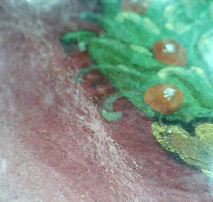 Prior to agreeing to it being digitised, the Gospel Lectionary was examined in the Old Library at Magdalen by Oxford Conservation Consortium’s Head of Preservation and Conservation, Jane Eagan, on 19 Dec 2016, using a digital microscope at about 30x magnification.