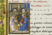In general, the major illuminations and borders are in fair to good condition. They have been damaged by handling, depending on where the painted areas are situated on the page. Where the paint is close to the lower right corner, there are handling creases, some stains and ingrained dirt caused by readers turning the leaves, resulting in pigment loss. The leaves are fairly heavy calfskin carefully prepared on both sides with a velvet-y surface, therefore they cling together slightly, and are harder to turn; as a result the writing support surface and pigments are abraded in areas. The resulting paint loss is usually minor, and the remaining paint appears stable. There were no signs of actively flaking pigment.